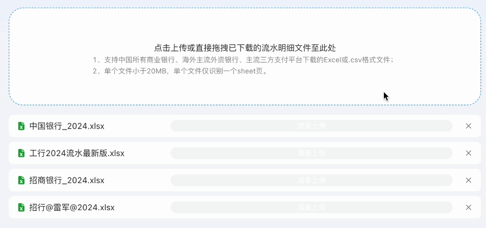 上传本人或已合法取得的他人银行流水(Excel/PDF/CSV 等),无需手工更改模板。
